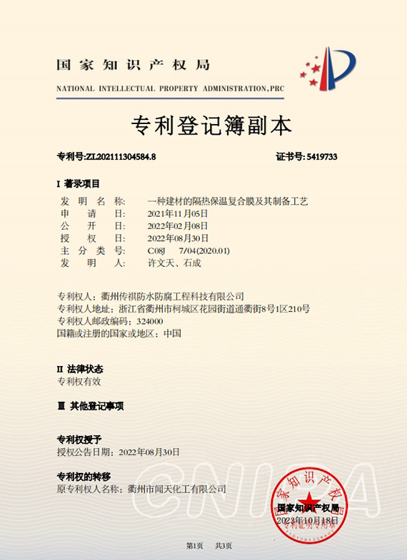 衢州傳祺新材料科技有限公司是衢州市聞天化工有限公司的下屬企業(yè);衢州市聞天化工有限公司成立于2003年,是國(guó)內(nèi)最早研發(fā)、生產(chǎn)氟碳涂料的企業(yè)之一。衢州傳祺新材料科技有限公司成立于2017年,公司專注于高分子氟材料的開(kāi)發(fā)和含氟材料在防腐、防水領(lǐng)域的應(yīng)用。經(jīng)過(guò)6年的不懈努力,已獲得了化工和建筑領(lǐng)域六項(xiàng)國(guó)家發(fā)明專利授權(quán)和兩項(xiàng)新產(chǎn)品科技成果獎(jiǎng),參與了中國(guó)建筑材料流通協(xié)會(huì)《房屋修繕?lè)浪こ桃?guī)范》標(biāo)準(zhǔn)的編制工作,中建協(xié)涂裝委員會(huì)浙西工作站設(shè)立在我公司。